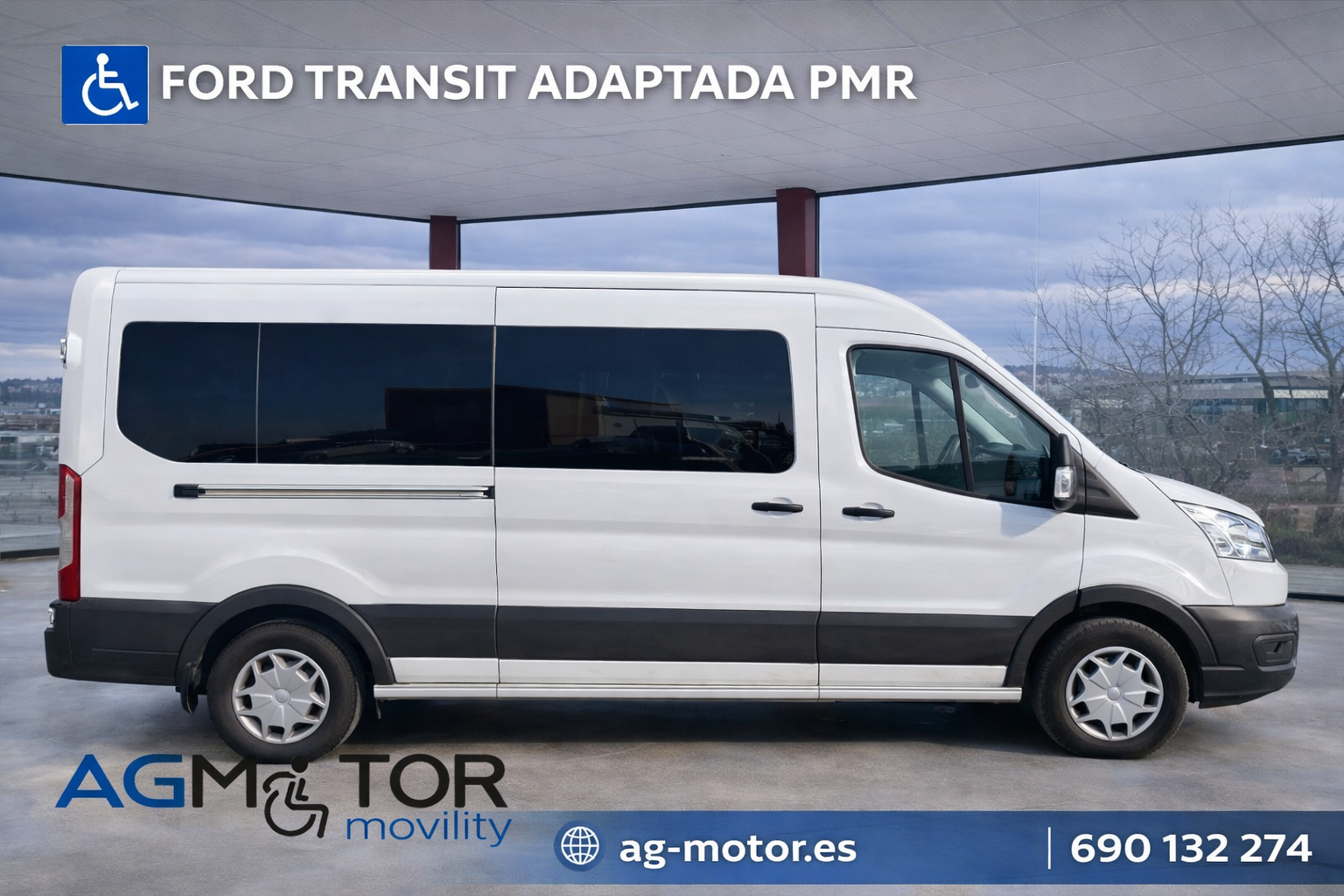 Ford Transit L3 H2 TDCI 130CV combi 9 plazas compuesta con acondicionamiento para transporte de 2 PMR en silla de ruedas mediante retención ubicado en la cuarta fila de asientos, PLATAFORMA ELEVADORA marca Ricon, peldaño lateral electrico, aire acondicionado en plazas traseras, numero de asientos 9 o 8+1 pmr o 7+2 pmr.