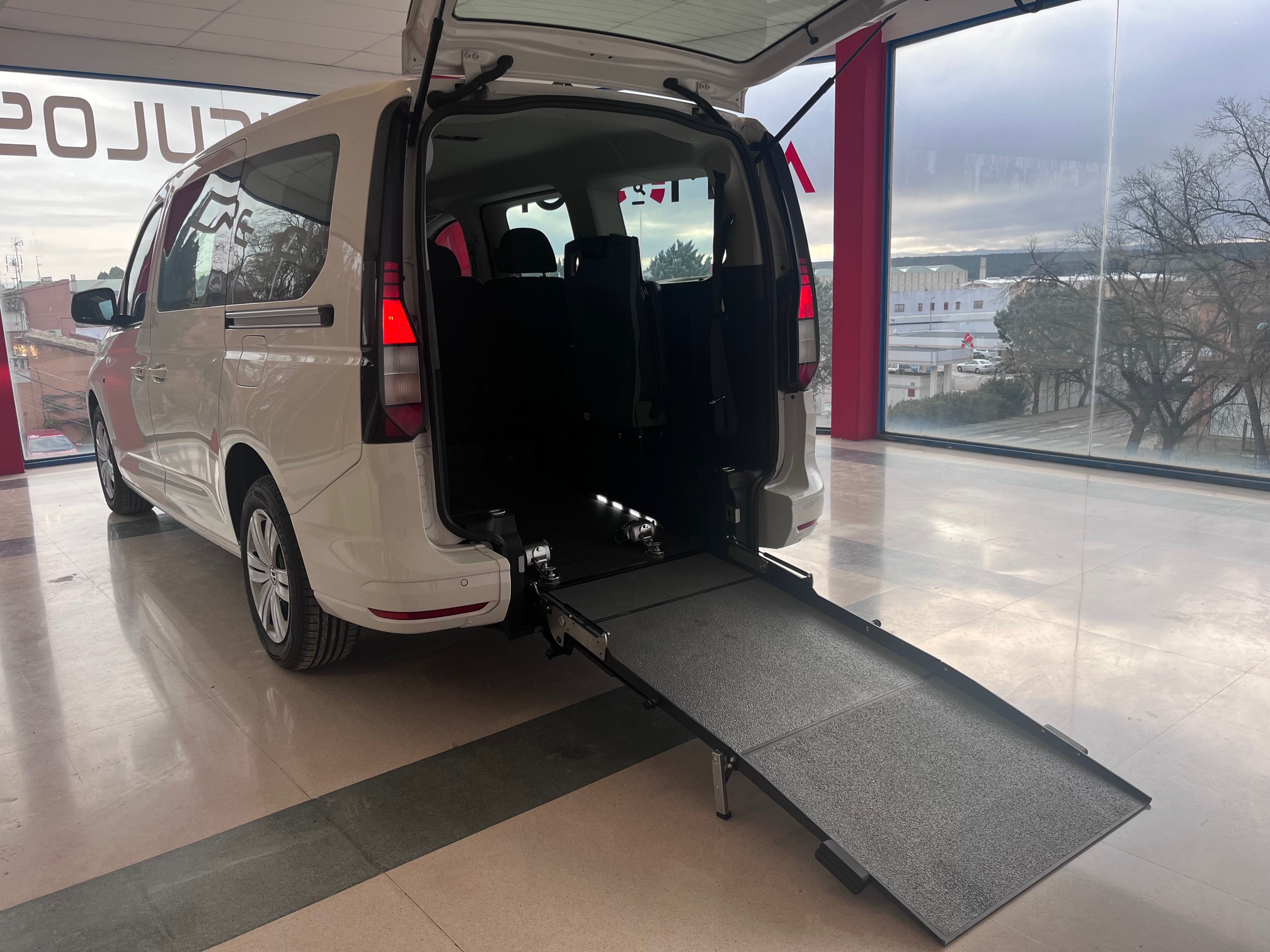 volkswagen caddy maxi 2.0 tdi de 102 cv, especialmente adaptada para personas con movilidad reducida. ideal como coche adaptado para silla de ruedas, turismo accesible o vehículo adaptado para transporte de personas con discapacidad. además este vehículo permite el uso de las 5 plazas habituales y al mismo tiempo que suma la plaza para la persona en silla de ruedas, haciendo un total de 6 plazas.